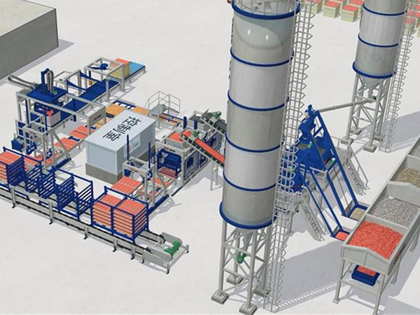 該全自動(dòng)生產(chǎn)線共分四個(gè)組成部分:配件攪拌系統(tǒng)、砌塊成型及上架、下架系統(tǒng)、碼垛送垛系統(tǒng)及全自動(dòng)集中控制系統(tǒng)。